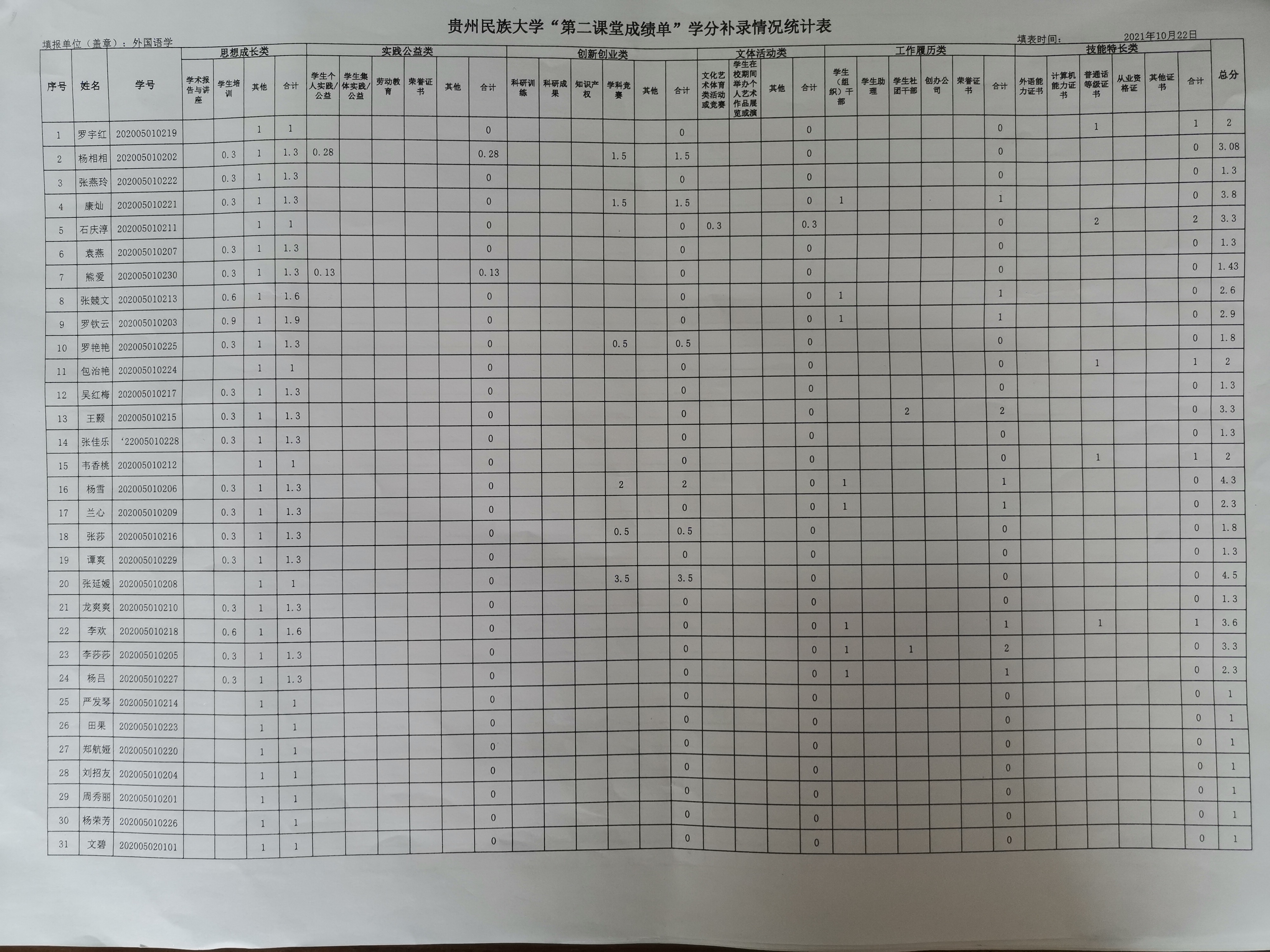 为进一步贯彻落实《教育部关于加快建设高水平本科教育全面提高人才培养能力的意见》(教高〔2018〕2号)文件、《高校共青团改革实施方案》和《关于全面加强新时代大中小学劳动教育的意见》精神,根据《贵州民族大学“第二课堂成绩单”制度实施办法》,现将易游在线2020级学生“第二课堂成绩单”补录学分公示如下: