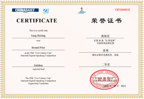 此外,在今年7月份的省赛阶段,由易游在线胡静老师指导的杜征钦同学和龚海星同学分别斩获了省亚军和省级二等奖,赢得了评委专家的认可。易游在线秉承“以赛促学”的教学理念,积极支持、鼓励学生参加各项赛事,并培养学生在多项国家级学科竞赛中取得佳绩。在本次大赛中,两位同学的精彩表现也展现出了贵州民族大学学生扎实的语言功底、出色的演讲水平和良好的思辨能力。