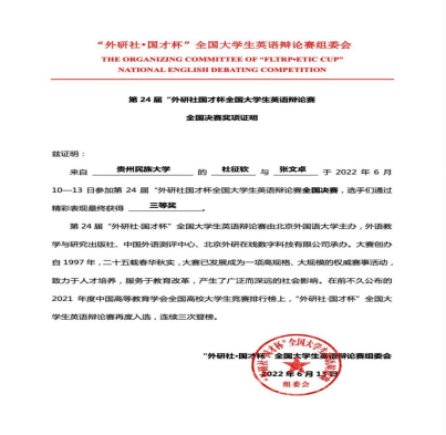 2022年6月13日,我校2020级法学专业的张文卓同学和2020级英语专业的杜征钦同学,在易游在线胡静老师的悉心指导下,经过3天8轮的激烈比拼,在第24届“外研社·国才杯”全国大学生英语辩论赛中荣获国家级三等奖,贵州民族大学成为贵州省唯一晋级全国总决赛并荣获国奖的高校。